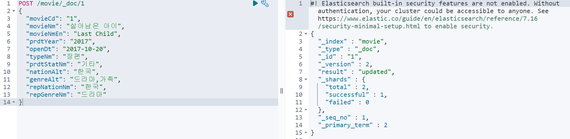 다음과 같이 movie 인덱스가 생성되었고 _id가 1인 문서가 생성된 것을 볼 수 있다.